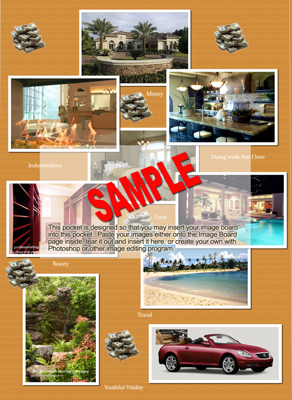 - An example of an Image Board I did in photoshop for the purpose of slipping into the clear front cover of the workbook. Now your workbook cover can be something you look at before you do anything. Envision having those things and that should raise your vibrations very quickly :).